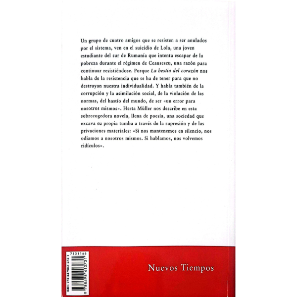 Un grupo de cuatro amigos que se resisten a ser anulados por el sistema, ven en el suicidio de Lola, una joven estudiante del sur de Rumanía que intenta escapar de la pobreza durante el régimen de Ceausescu, una razón para continuar resistiéndose. Porque La bestia del corazón nos habla de la resistencia que se ha de tener para que no destruyan nuestra individualidad. Y habla también de la corrupción y la asimilación social, de la violación de las normas, del hastío del mundo, de ser «un error para nosotros mismos». Herta Müller nos describe en esta sobrecogedora novela, llena de poesía, una sociedad que excava su propia tumba a través de la supresión y de las privaciones materiales: «Si nos mantenemos en silencio, nos odiamos a nosotros mismos. Si hablamos, nos volvemos ridículos».
