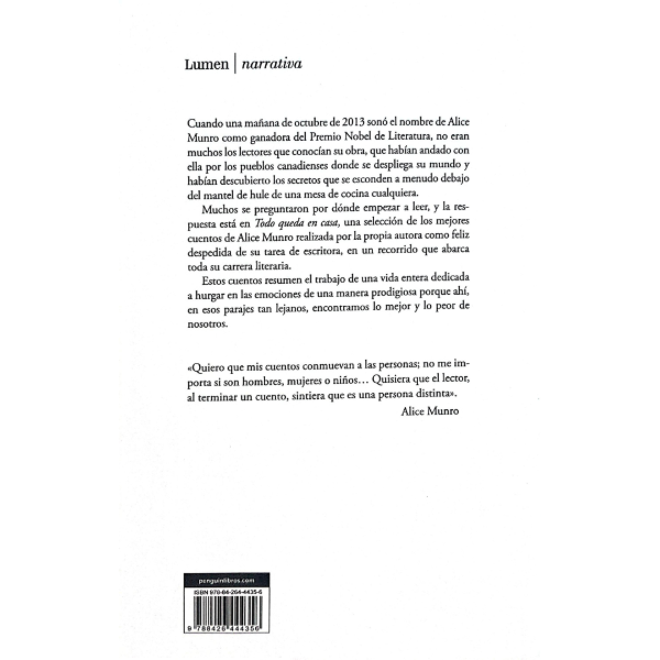 Una selección de los mejores cuentos de los últimos seis libros de Alice Munro, la dama de las letras canadienses, ganadora del premio Nobel de Literatura en 2013 y una de las principales voces actuales en lengua inglesa. Ella misma ha hecho la selección de estos 25 cuentos, sus preferidos dentro de su brillante carrera. Esta obra toma su título de un cuento que aparece en Odio, amistad, noviazgo, amor, matrimonio y trata uno de los temas principales de la producción literaria de la autora: la familia.