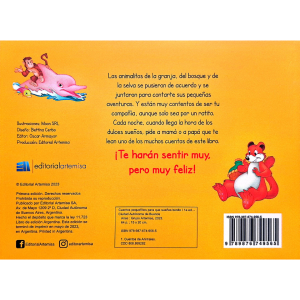 Los animalitos de la granja, del bosque y de la selva se pusieron de acuerdo y se juntaron para contarte sus pequeñas aventuras. Y están muy contentos de ser tu compañía, aunque solo sea por un ratito. Cada noche, cuando llega la hora de los dulces sueños, pide que te lean uno de los muchos cuentos de este libro. ¡Te harán sentir muy feliz!